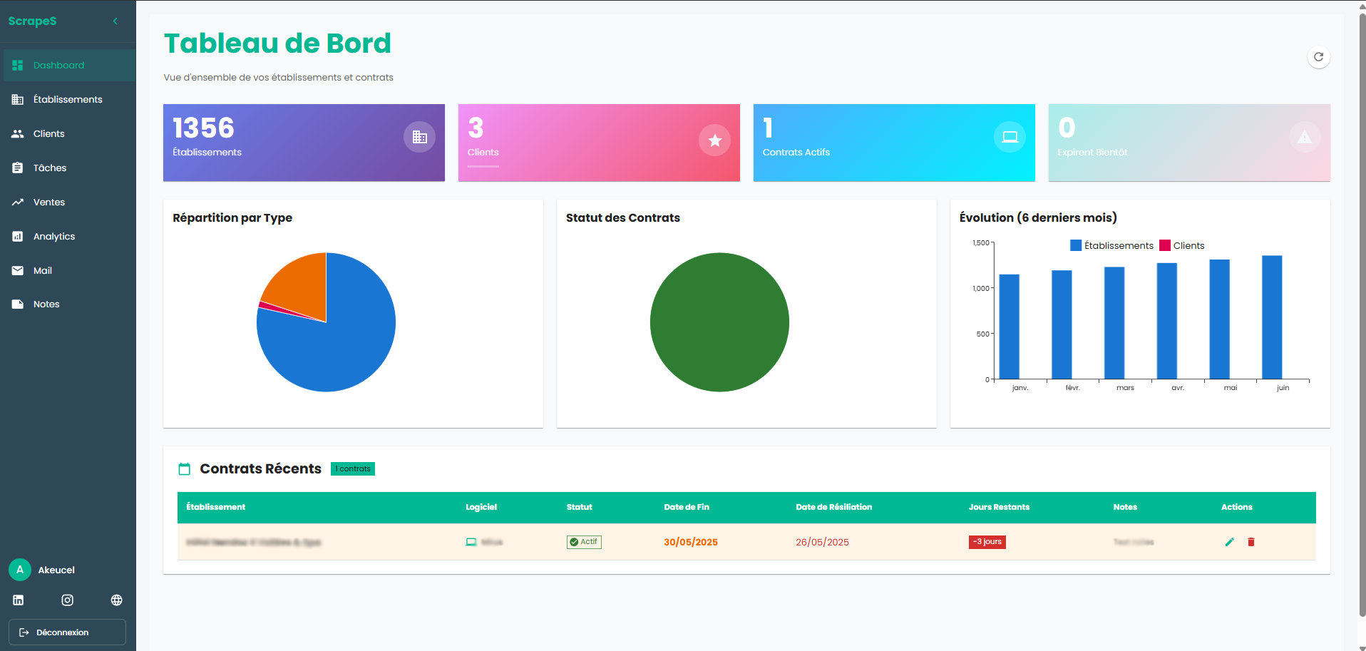 Application web de gestion d'établissements hôteliers permettant de suivre les relations commerciales avec une base de données classée par canton et type. Fonctionnalités incluant la gestion des clients, le suivi des contrats avec dates d'expiration, un tableau de bord statistique et des alertes pour les contrats expirant bientôt.